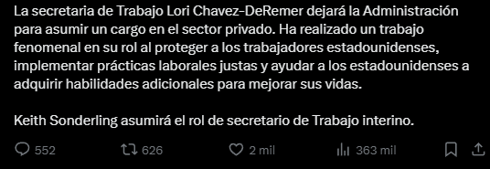 Con esta decisión, Chavez-DeRemer se convierte en la tercera funcionaria de nivel ministerial que deja el gabinete en dos meses.
