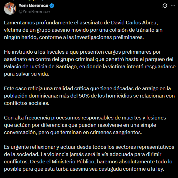La procuradora general Yeni Berenice Reynoso condenó el caso de David Carlos Abreu y ordenó acciones penales inmediatas.