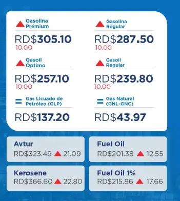 En cuanto a los precios, la gasolina premium se ubicará en RD$305.10, la regular en RD$287.50, el gasoil regular en RD$239.80 y el óptimo en RD$257.10.