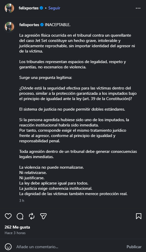 El abogado Félix Portes calificó como inaceptable la agresión física registrada dentro de un tribunal contra un querellante vinculado al caso Jet Set.