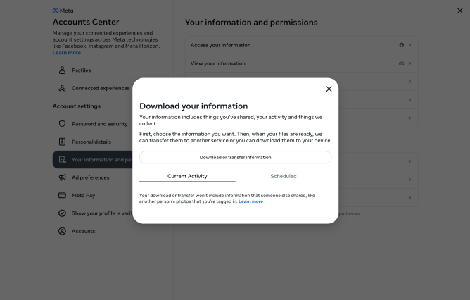 5. Escoge las cuentas (Facebook, Instagram, Meta Horizon) y los datos que deseas descargar.